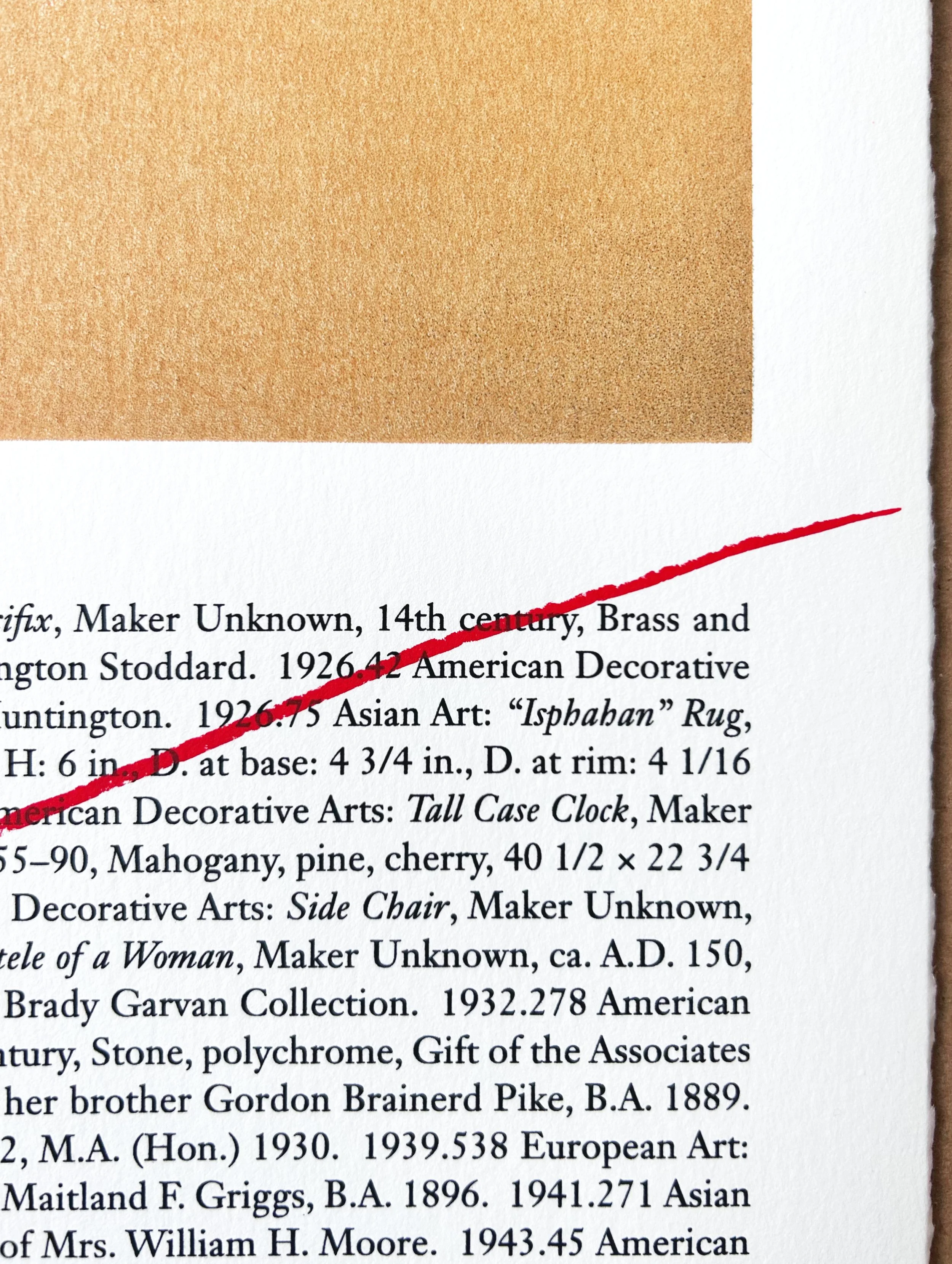 Underneath the image of the weight, Salane shares a text selection of other art objects throughout the years that were deaccessioned from the university’s art gallery. The significance of what remains and what departs from a museum’s collection has resonance temporally, culturally and reflects the values of an institution. Clock Weight is the first print in Salane’s “Deaccessions” series.